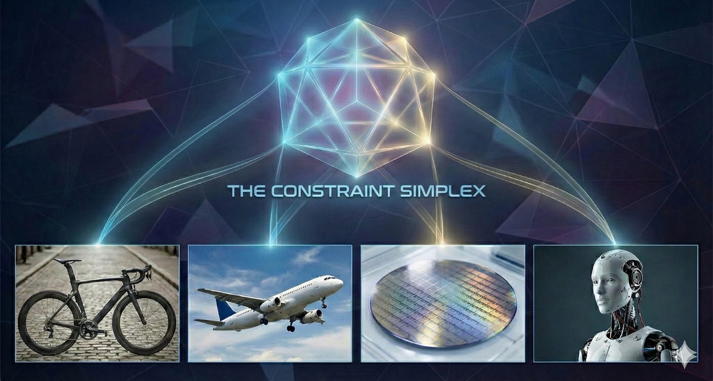 Every technology lives inside a possibility space shaped by physics, materials, energy, economics, and human needs. The constraint simplex is simply a way of making those faces visible; the places where progress slows and the edges where new architectures start to emerge.